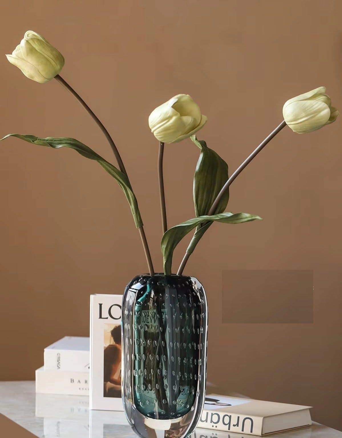 👉Kiểu dáng đơn sắc, đường nét thanh lịch và đơn giản, bình hoa với nhiều bông hoa tạo nên bầu không khí yên bình, tạo nên vật trang trí nhà nhỏ nhắn và tinh tế.