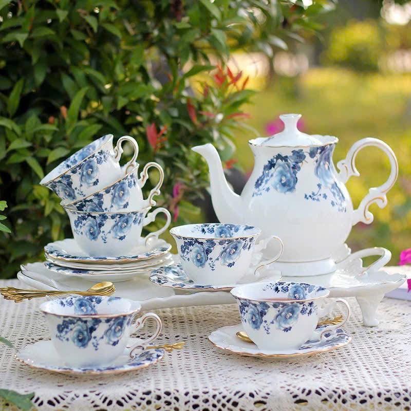 Set gồm 16 món: 1 ấm, 6 cốc, 6 đĩa, 1 hũ đường, 1 hũ sữa, 1 giá treo