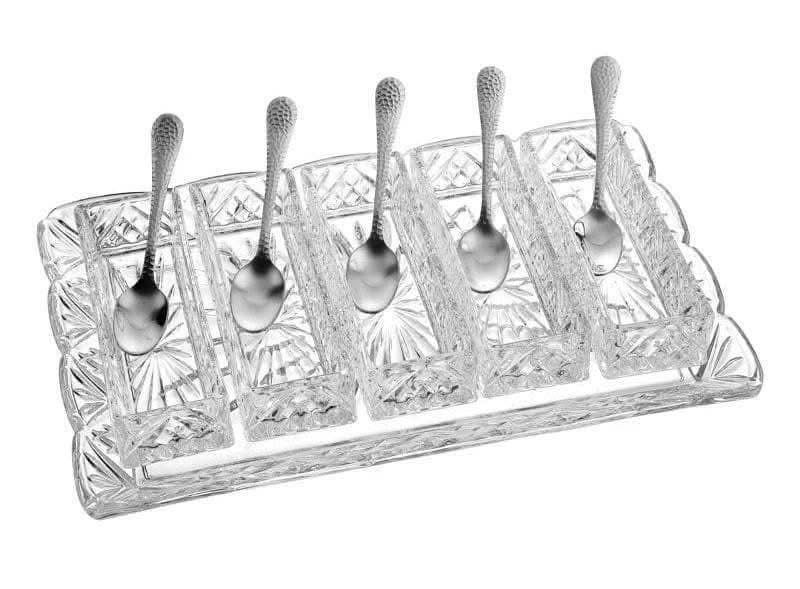 Sét pha lê này là phụ kiện hoàn hảo cho mọi nhu cầu tiệc tùng của bạn và khách mời sẽ thấy sự hữu ích của bộ đồ ăn này như một khay có thể chia thành 5 đĩa đựng cho 5 món khai vị khác nhau hoặc có thể làm khay đựng các loại gia vị, đồ ăn kèm