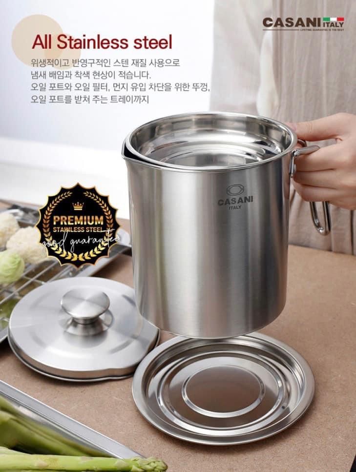 - Lưới lọc đi kèm giúp lọc các mảnh vụn của đồ chiên, rán… một cách nhanh chóng và tiện lợi. Vì vậy dầu khi đựng trong Ca lọc Casani đều như dầu mới vậy :$