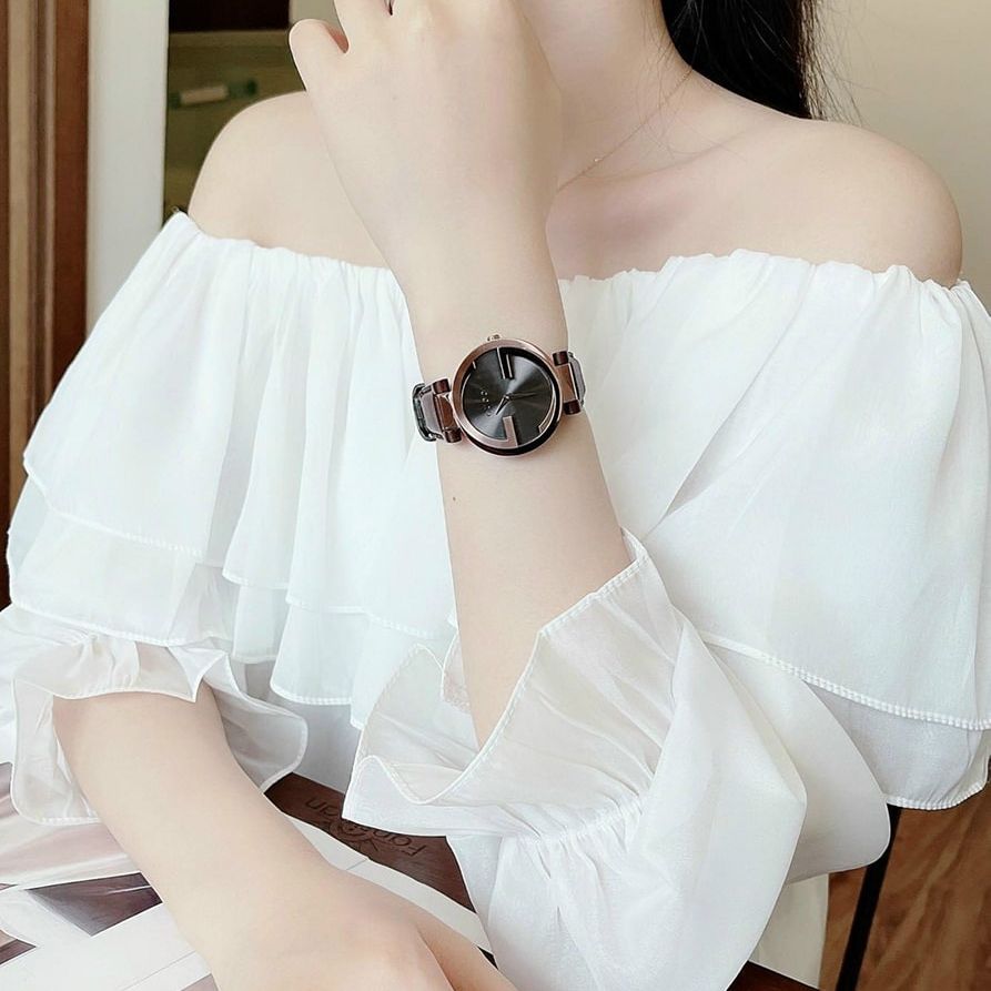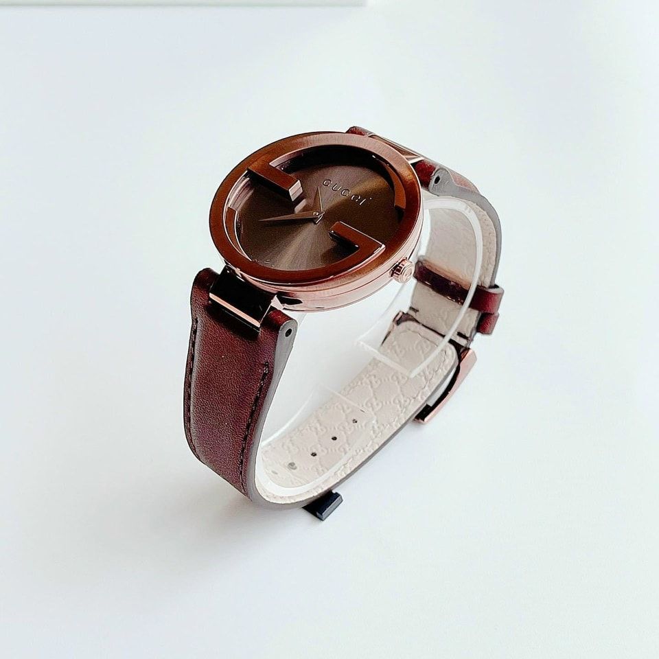 - Vỏ bằng chất thép không gỉ mạ màu Nâu đồng siêu sang .Mặt đồng hồ mang đậm chất GC với motif chữ G kép