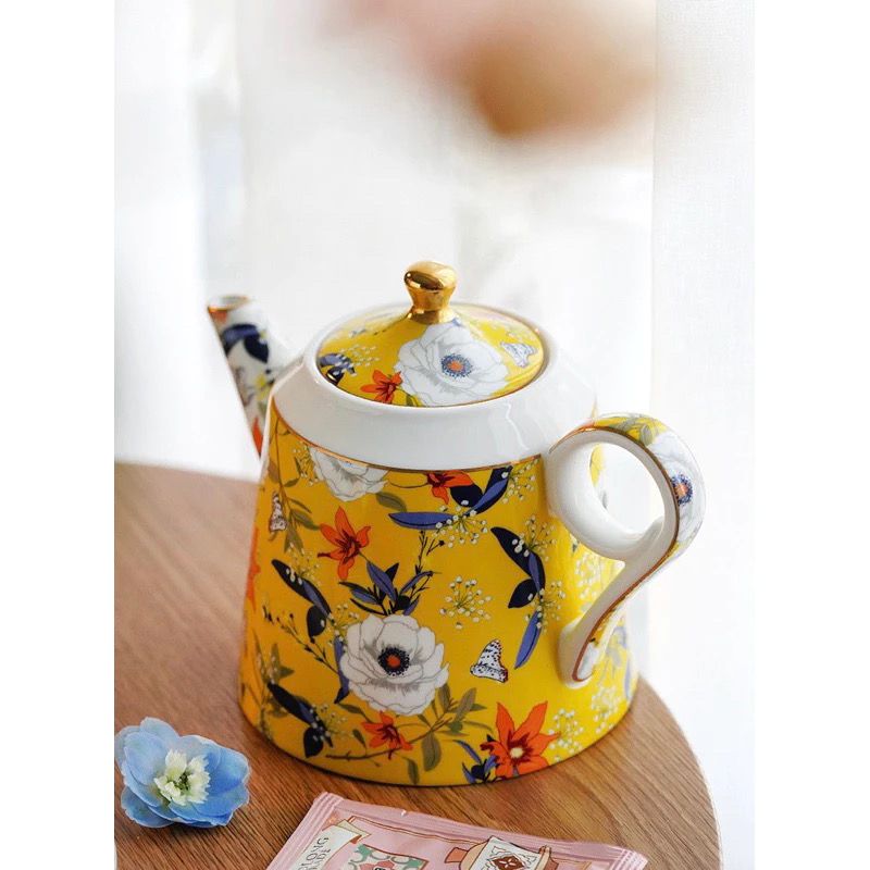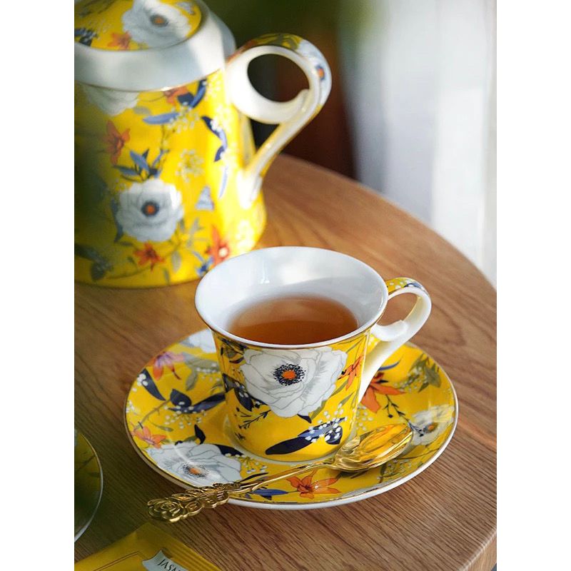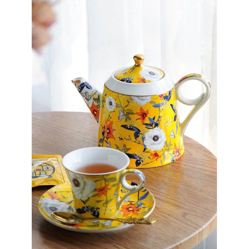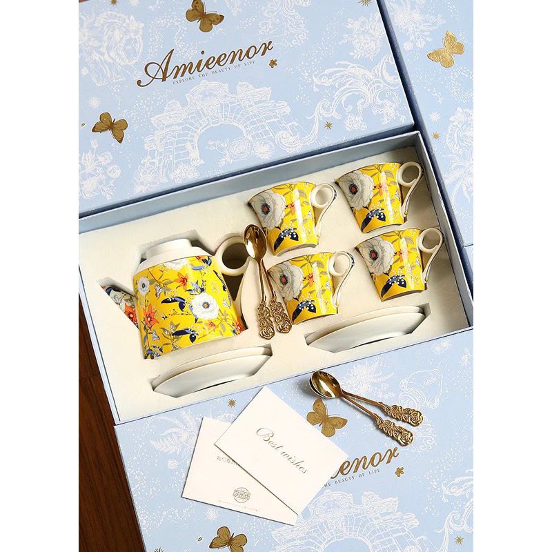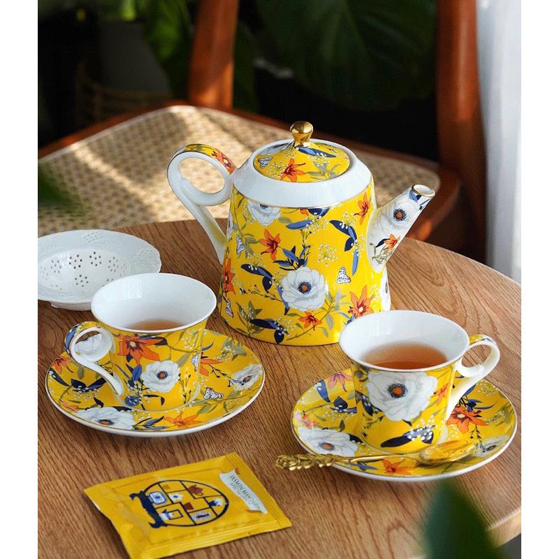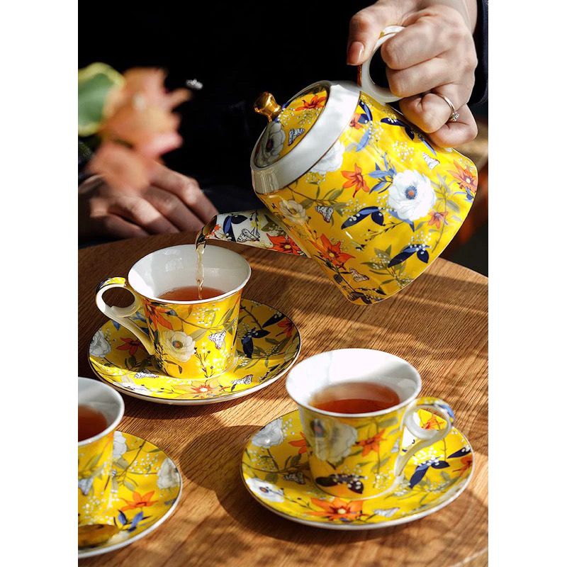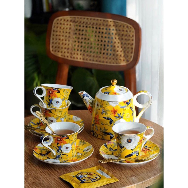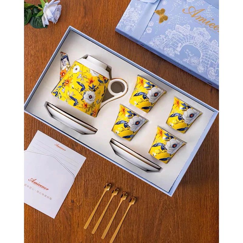 Bộ ấm trà vàng & tách đĩa trà sứ xương Amineer
