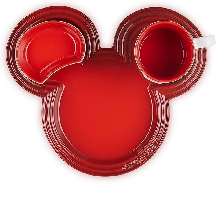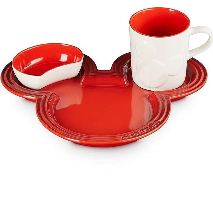 - Bộ 3 món này kết hợp một chiếc đĩa hình chuột Mickey đơn giản với một chiếc đĩa nhỏ và một chiếc cốc hai màu phù điêu có hình chuột Mickey.